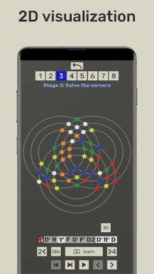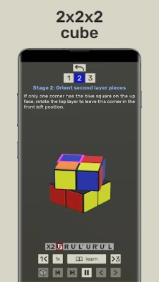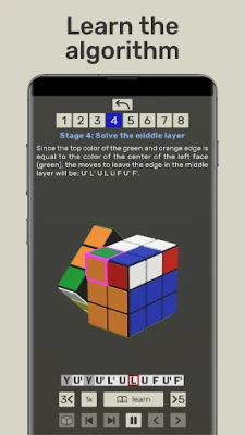 In addition to teaching you the algorithm, the application shows you in practice what steps should be applied for any color configuration of the cube. All this with detailed explanations for each step. You will be able to see each stage of the resolution in the order you want and you will be able to see in a highlighted way the important pieces of each move, in order to better understand the algorithms.