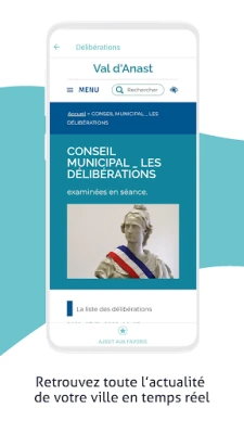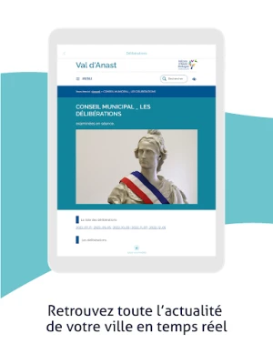 L'application de la ville du Val d'Anast vous propose les actualités, l'agenda des manifestations, des notifications en temps réels et bien plus encore : - Ecowatt - Actualités - Magazine - Billetterie - Ma Mairie - Collecte des déchets - Signaler - Portail Famille - Urgence Secours - Restauration scolaire / Garderie - Météo - Facebook - Démarches administratives - Cinéma - Associations - Santé - Délibérations - Val d'Anast en images
